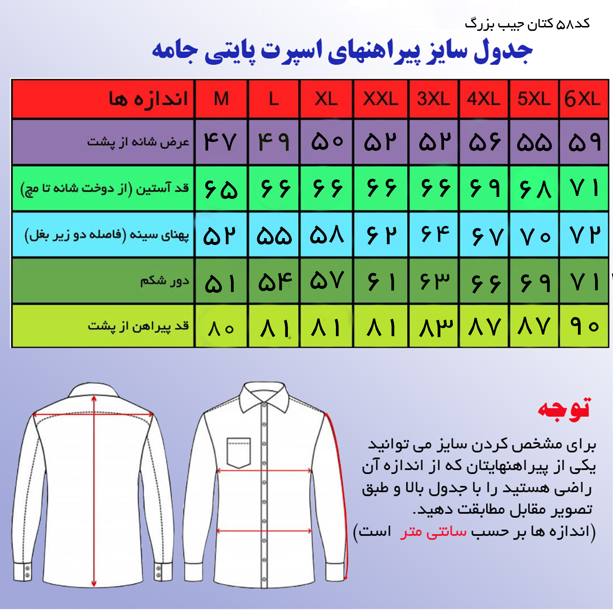 برای انتخاب سایز حتما از جدول سایز استفاده نمایید و توجه داشته باشید که پیراهنهای مردانه، به دلیل داشتن الگوها و قواره های متفاوت، دارای چندین سایز M یا L و … متفاوت هستند و ممکن است پیراهن‌هایی با سایز یکسان، اندازه‌های مختلفی داشته باشند. پس حتما و الزاماً اندازه‌های پیراهن مناسب خودتان را با اندازه‌های جدول سایز مطابقت دهید.