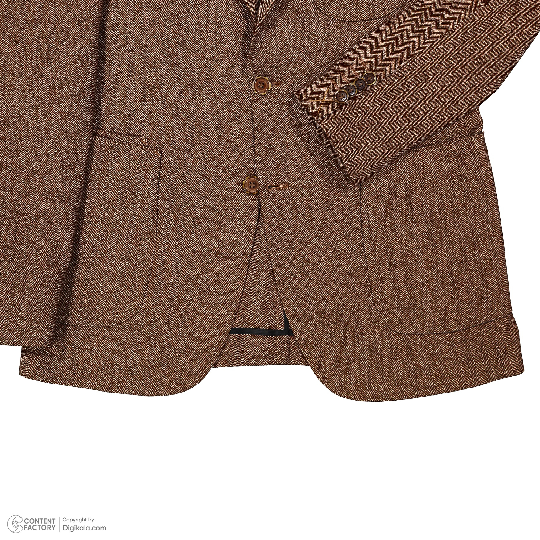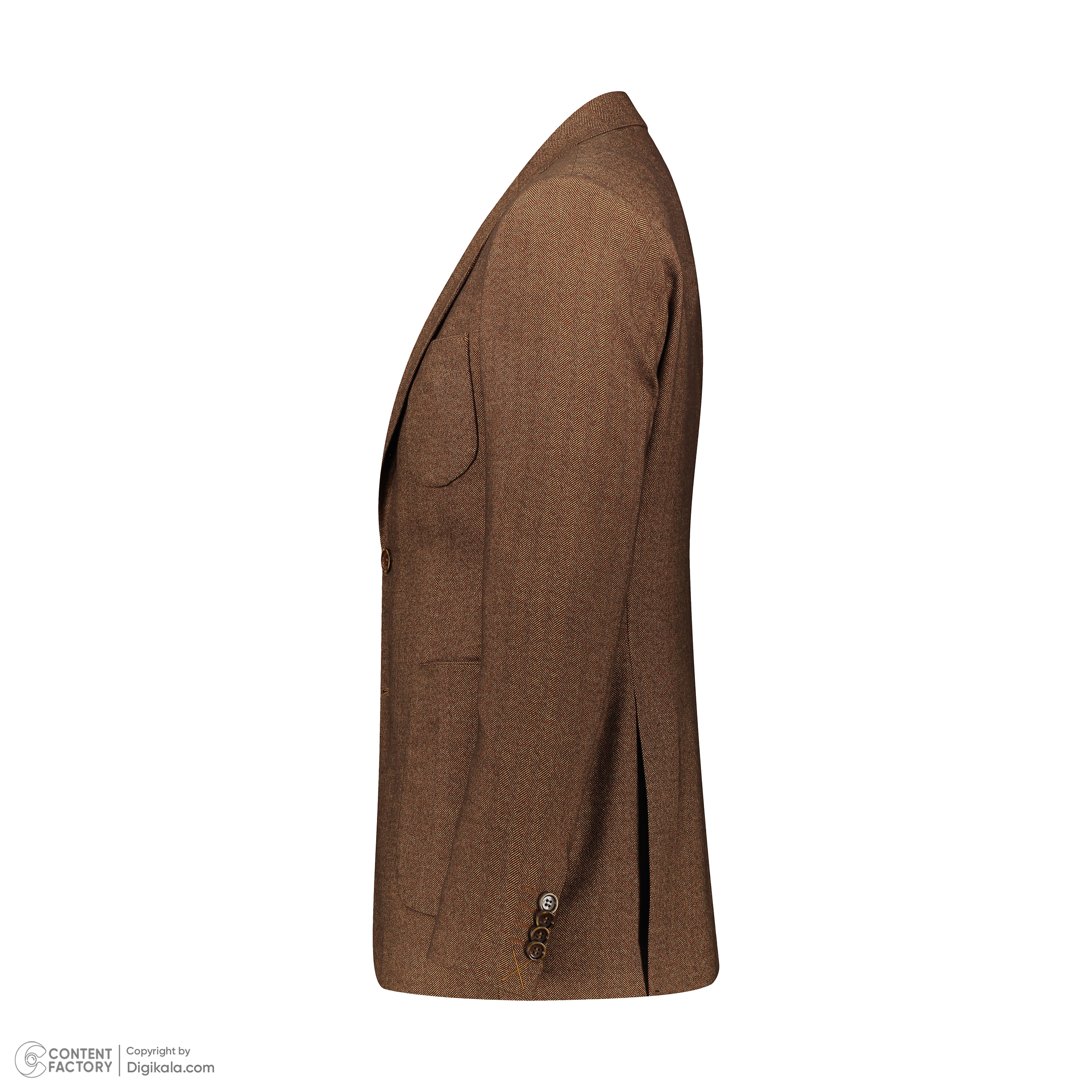 یقه انگلیسی دو دکمه دو چاک نیمه آستر سه جیب پاکتی در جلو، سه جیب مخفی در داخل